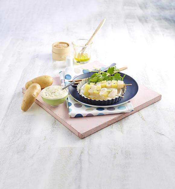 ②• DÉCOUPEZ les Saint-Jacques en deux dans le sens de l’épaisseur. Épluchez et découpez le reste de Pompadour Label Rouge en rondelles de la même épaisseur que les Saint-Jacques et faites-les cuire 20 min dans l’eau froide salée. Montez les brochettes en alternant rondelle de Saint-Jacques et rondelle de Pompadour Label Rouge.