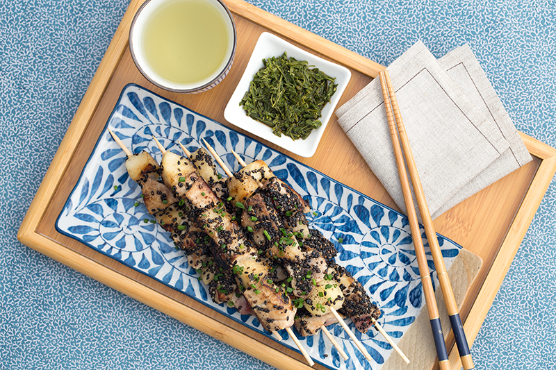 Servir les brochettes avec les feuilles de thé infusées, arrosées de sauce de soja. Accompagner de la liqueur* de thé.