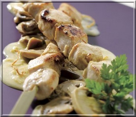 Brochettes de Volaille – Crème de Maïs et Poêlée de Champignons