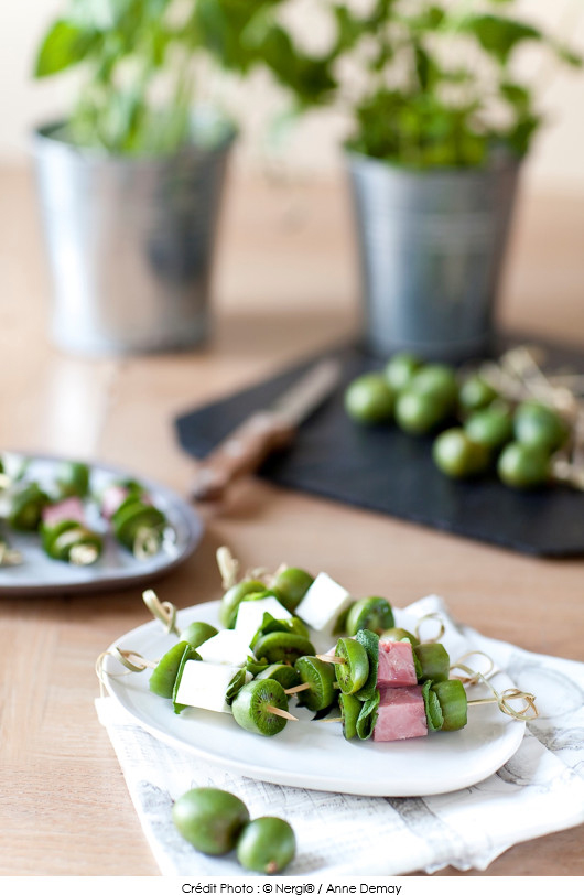 Sur des piques d’apéritifs, alterner un Nergi® coupé en deux, une feuille de menthe pliée en deux, un cube de jambonneau, une feuille de menthe pliée en deux et un demi-Nergi®.