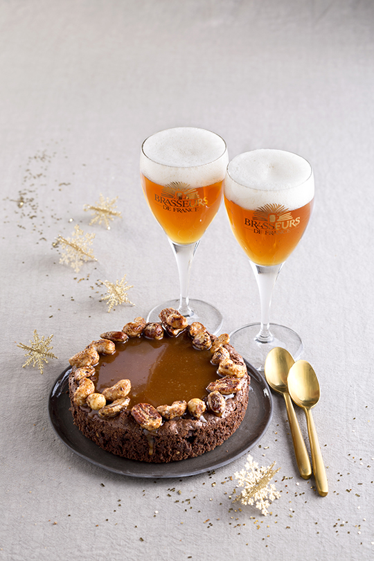 Une bière de Noël, aux notes aromatiques de cacao et d’épices, se mariera à la douceur du caramel présent dans le brownie.