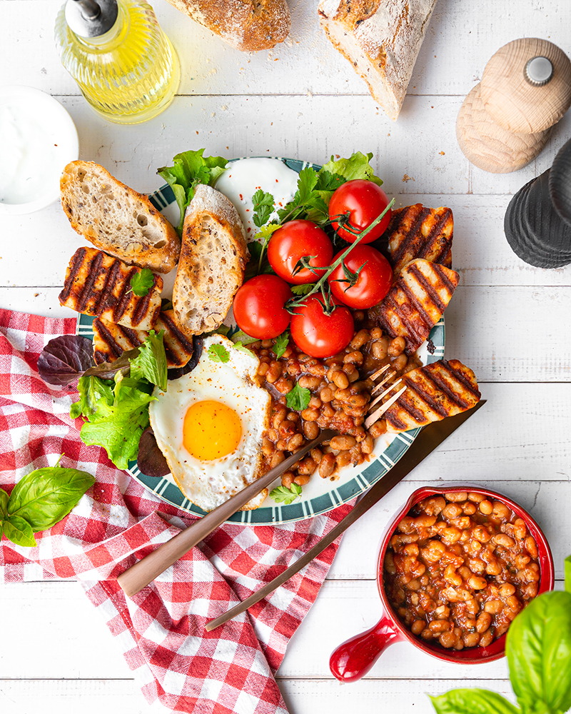 ⑥• Dresser les assiettes en commençant par étaler un peu de sauce au yaourt. Placer les jeunes pousses de salade assaisonnée. De l’autre côté ajouter les haricots bien chauds et le halloumi.