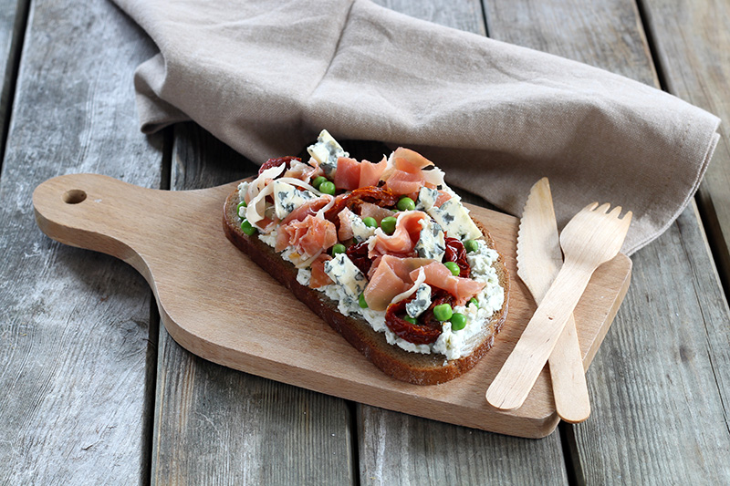Une délicieuse tartine accompagnée de Fourme d’Ambert et jambon Serrano pour un déjeuner sur le pouce mais équilibré ! À servir agrémentée d’une salade de roquette.