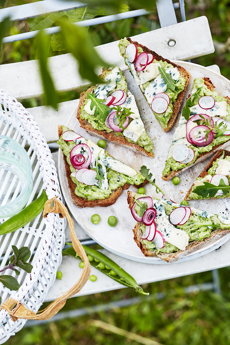 ⑦• Garnir chaque tranche de pain de crème de petit pois à la menthe. Déposer des tranches de fourme d'Ambert, des rondelles de radis.