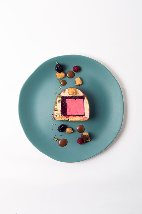 – Terminer avec la mousse framboise et déposer le biscuit pour « fermer » la bûche.