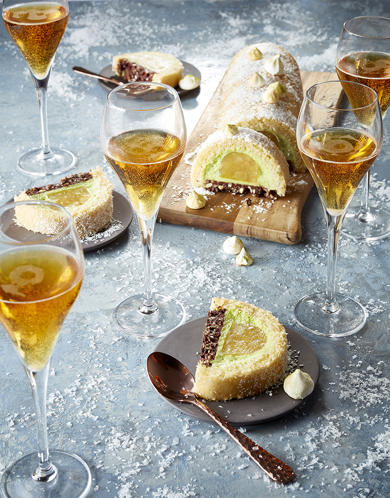 Bûche crème de marron-thé vert matcha, tofu d’amande au cidre