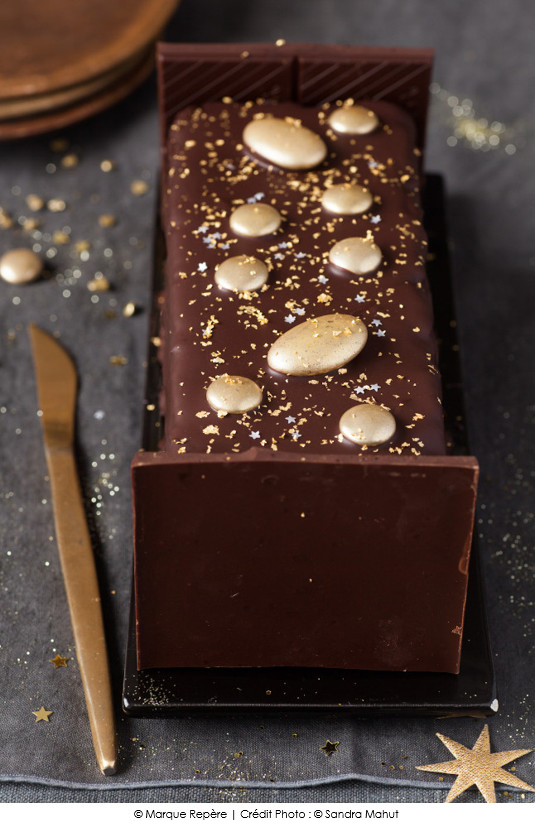 Astuces décoration : à chaque extrémité de la bûche, coller une demie plaquette de chocolat noir extra 47% de cacao Tablette d’Or.