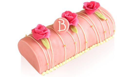 Fabriquer 3 roses en pâte d’amande rose fuchsia et des feuilles en pâte d’amande vert et les disposer sur le dessus de la bûche.