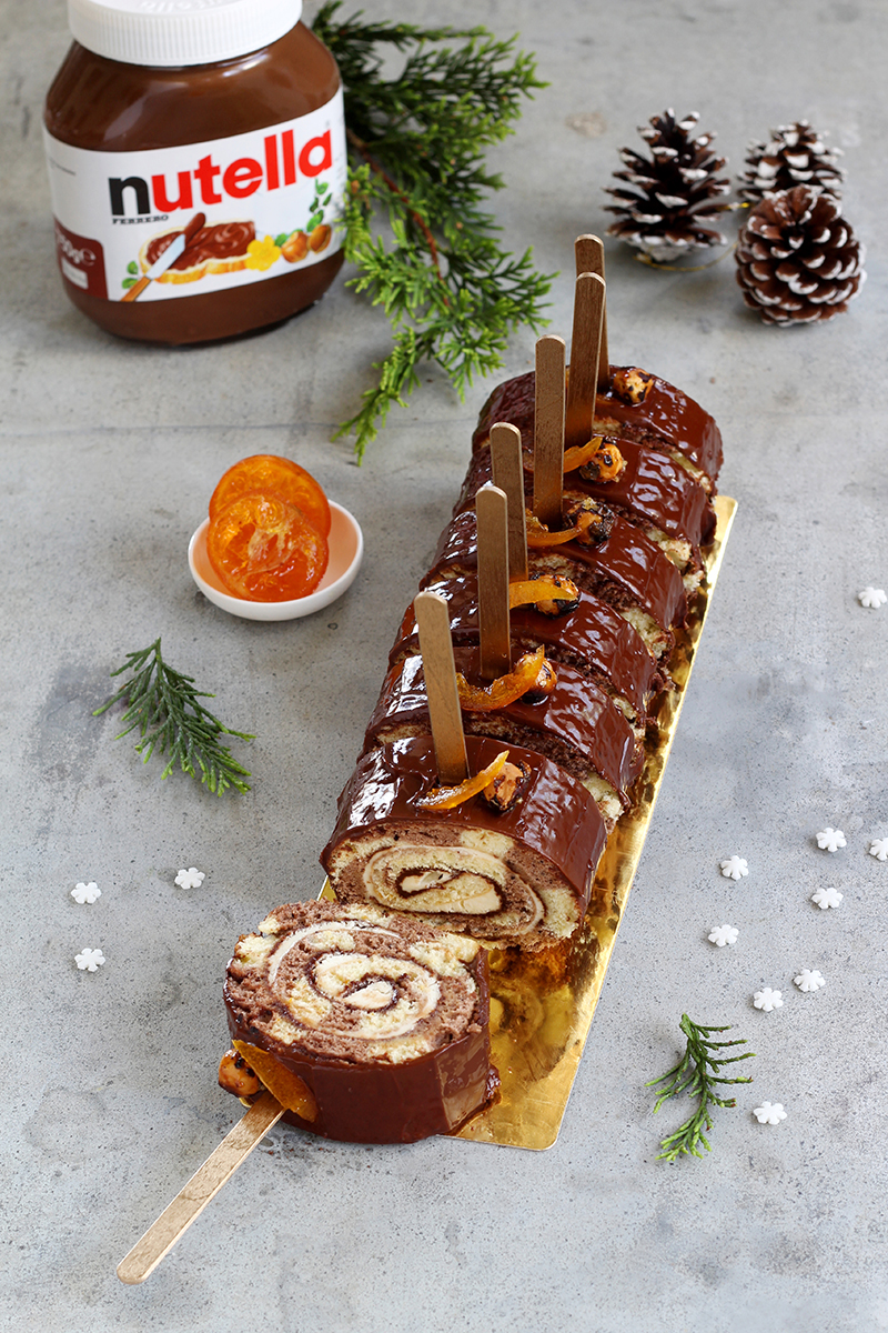 ⑥• Après le temps de pause, coupez le roulé en 10 parts. Enfoncez un bâtonnet en bois au milieu de chaque part et décorez ensuite d'oranges confites et de noisettes caramélisées.