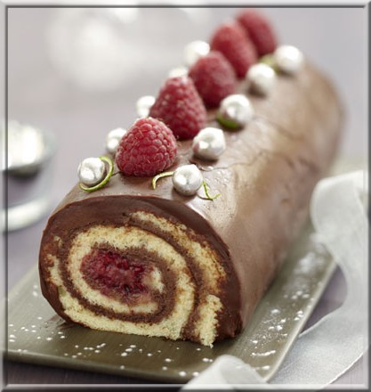 7-Étalez le reste de ganache sur la surface, mettez le roulé au frais au moins deux heures. Décorez avec le reste de framboises et des billes argentées au chocolat.
