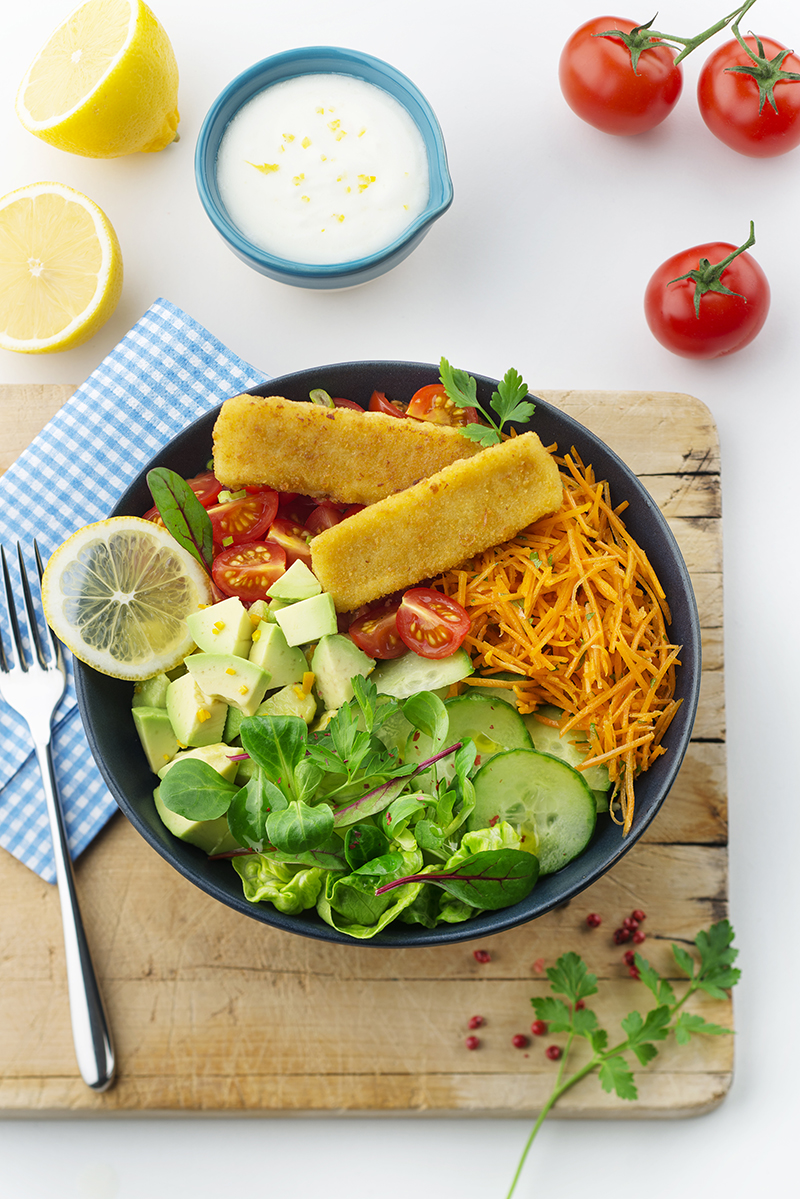 Buddha Bowl et bâtonnets de poisson pané Croustibat