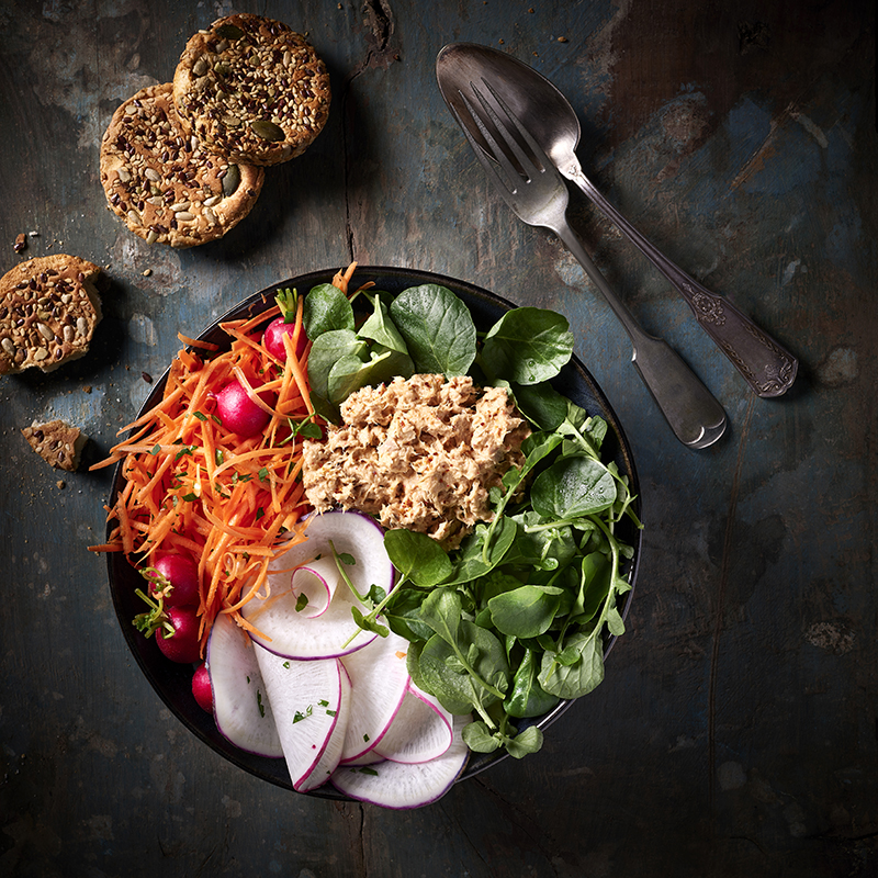 ③• Dressez les buddha bowl dans un bol et déposez les carottes râpées, la mâche, les radis entiers et les radis coupés en forme de fleur et les Rillettes Incroyables de thon piment d’Espelette.