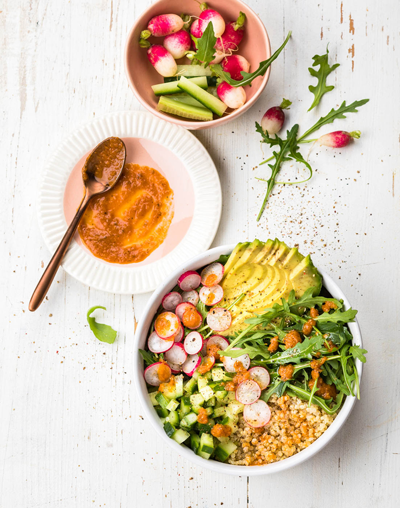 Disposez les ingrédients dans votre bol et nappez de vinaigrette.