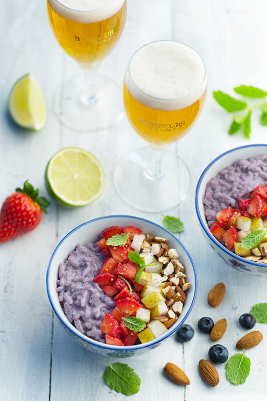 ⑤• Dresser les bols en répartissant le riz au lait aux myrtilles. Disposer joliment les cubes de fraises et poires, puis les amandes grillées.