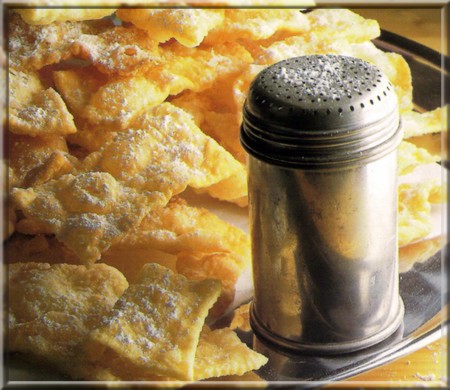 3.Plonger les bugnes dans un bain d'huile de friture très chaude, 3 ou 4 à la fois, en, les faisant dorer des 2 côtés. Les retirer avec une écumoire et les laisser égoutter sur du papier absorbant. Saupoudrer de sucre glace et disposer sur un grand plateau garni d'une serviette.