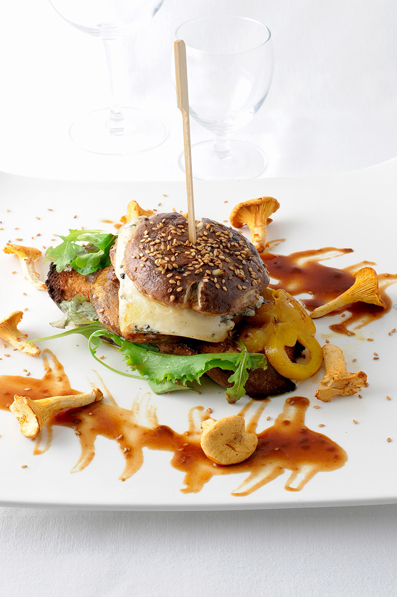 ②• Piquez les têtes de cèpes à l’ail et passez-les à la plancha (aller –retour). Poêlez, 4 tranches de foie gras frais (80g) (aller-retour). Faites de même pour les 4 tranches de magret (aller-retour) à la plancha. Salez et Poivrez.