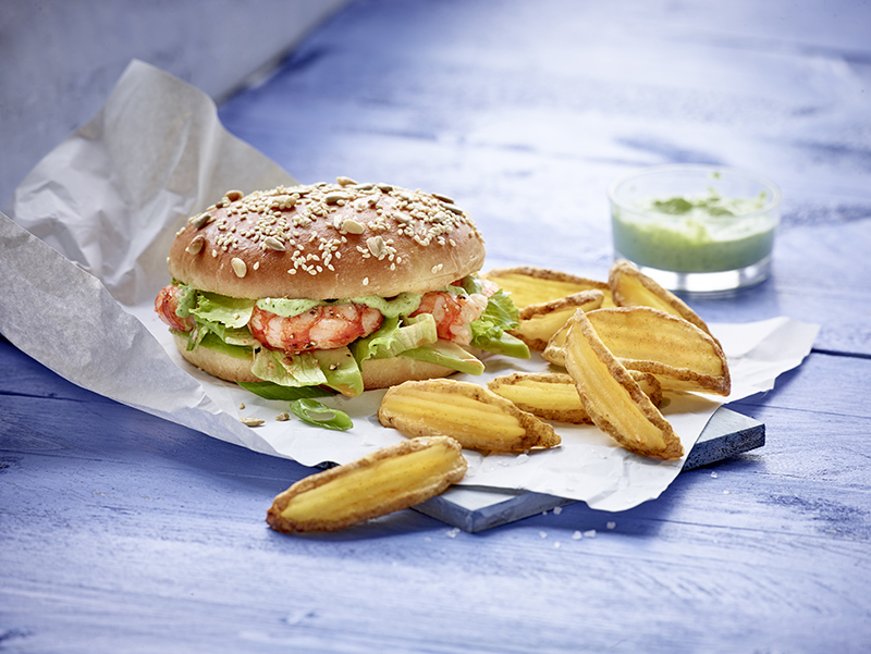 Burger aux crevettes et sauce Pesto accompagné de Côté Chef