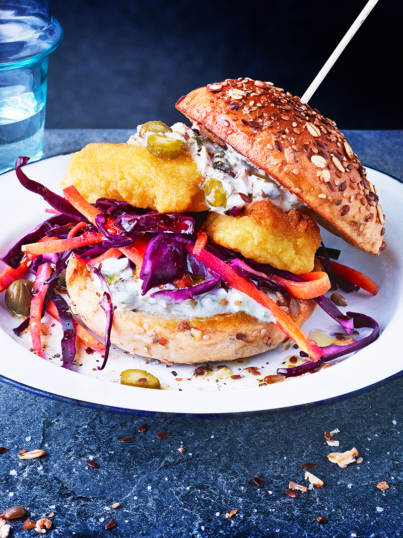 Grillez les pains, tartinez-les de sauce tartare, ajoutez des légumes et les bâtonnets de poisson et servez sans attendre avec le reste de sauce.