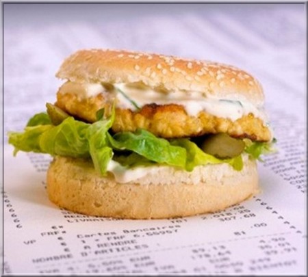 8- Couper les petits pains en deux. Garnir une face de sauce, déposer une feuille de salade, les cornichons émincés, la viande. Couvrir de nouveau de sauce au yaourt et de l'autre moitié de pain.