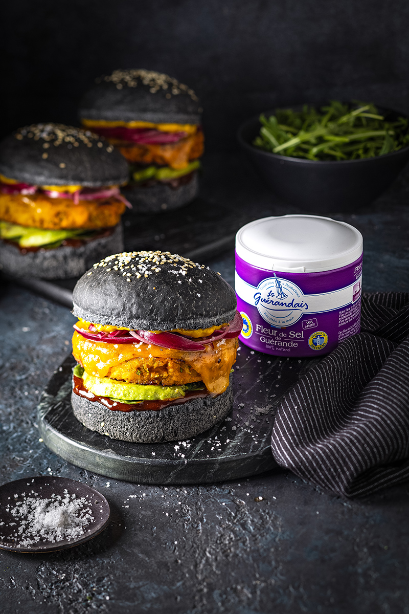 Piquez les patates douce et placez-les dans un four à 180°C (Th.6) pour 1h. Faites cuire les lentilles dans une casserole d’eau bouillante pendant 15 min puis égouttez bien. Faites revenir à feu moyen dans l’huile l’échalote, l’ail, les oignons hachés et le curry pendant 3 min. Écrasez la chair de la patate douce avec les lentilles, les oignons cuits, la fécule, les épices, l’œuf, du sel et du poivre. Formez des steaks sur une plaque recouverte de papier cuisson, arrosez d’huile, saupoudrez de Fleur de Sel Le Guérandais et enfournez pour 15 min à 190°C (Th.6-7). Ajoutez les tranches de fromage dessus, et les buns coupés en deux pour les faire toaster.
