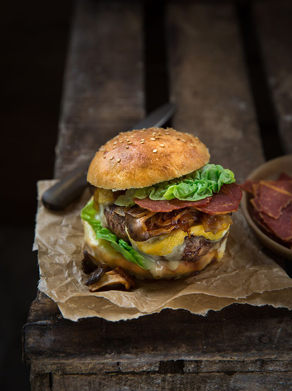 ⑨• Pour monter les burgers, placer les steaks au reblochon sur la base puis ajouter les oignons, les champignons, les chips de Jambon cru Aoste et une feuille de salade.