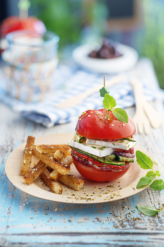 ⑨• Fermer le burger en plaçant l’autre demie tomate.