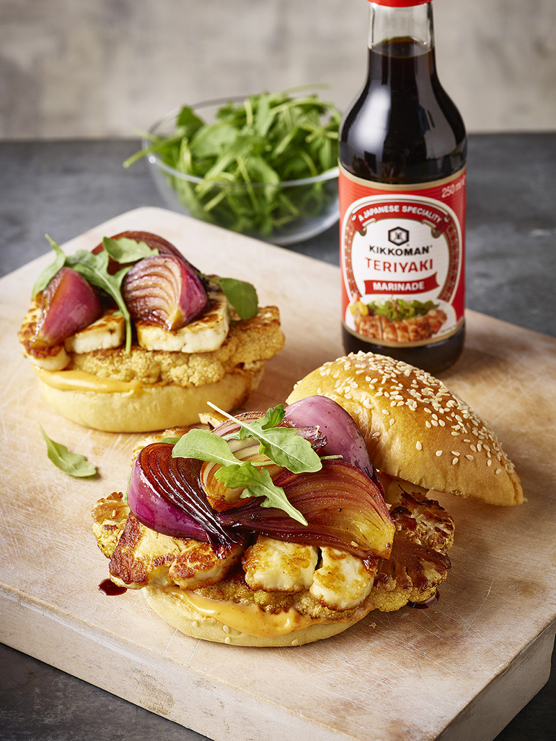 ⑥• Mélanger la mayonnaise avec la sauce Sriracha et le jus de citron vert. Couper en deux les petits pains et répartir un peu du mélange à base de mayonnaise sur les moitiés inférieures. Garnir d’un pavé de chou-fleur, de 2 tranches d’halloumi, d’un peu d’oignons et de roquette et disposer par-dessus la moitié supérieure du petit pain.