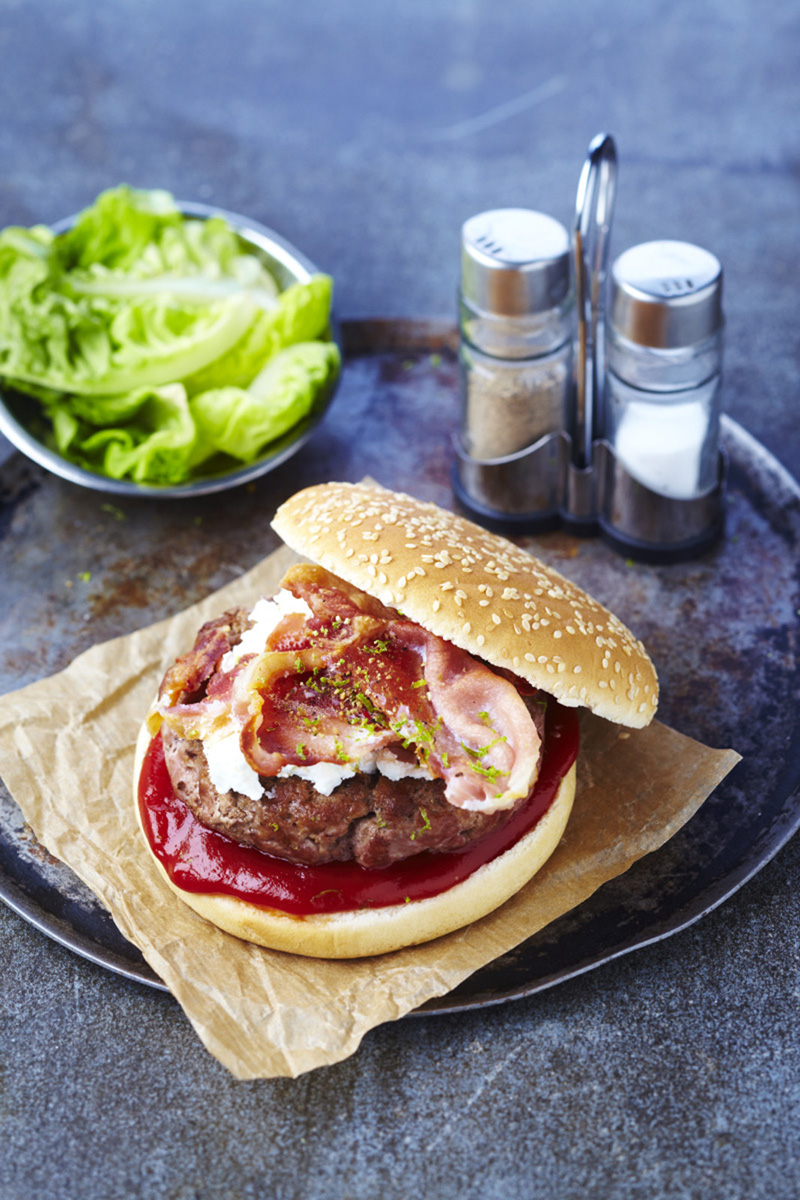 ⑥• Napper la base des pains avec le ketchup, poser les palets, les recouvrir de chèvre, ajouter le bacon, puis renfourner 3 minutes. Poser les chapeaux des pains et écraser légèrement pour bien maintenir la garniture.