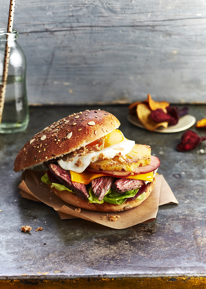 Servir les burgers de hampe de bœuf à l’australienne accompagnés de chips.