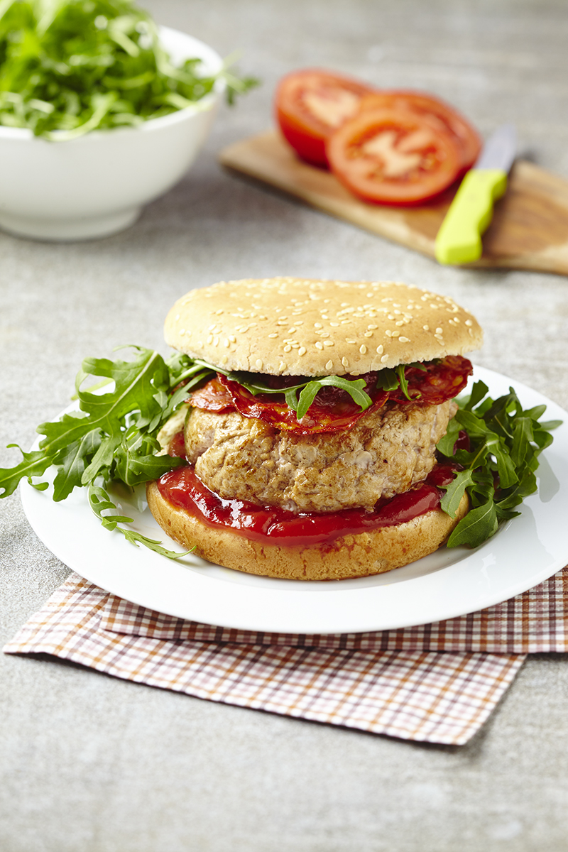 Servir les burgers de veau au chorizo et à la roquette accompagnés d’une salade de tomates.