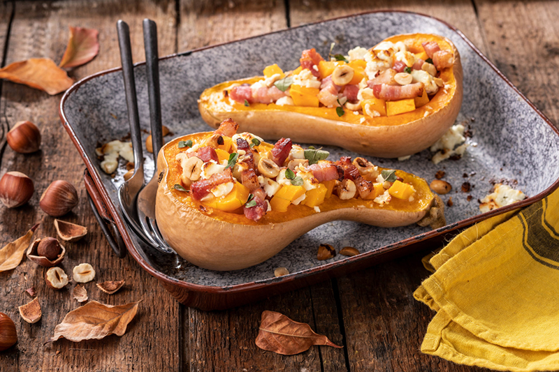 ⑤• Mélangez tous les ingrédients et garnissez les demies courges butternut de cette farce. Parsemez d’herbes.