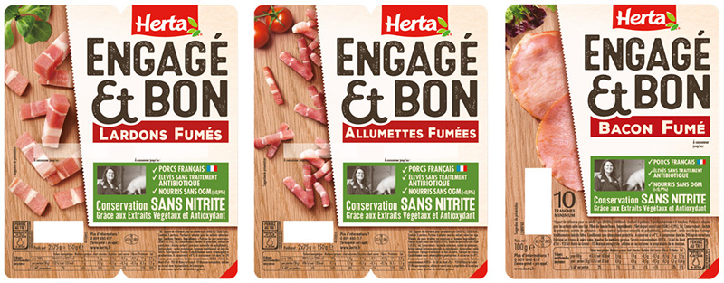 Les nouvelles recettes HERTA® répondent aux exigences de qualité de la gamme HERTA® Engagé et Bon. Elles sont élaborées à partir de porcs français élevés sans traitement antibiotique, nourris sans OGM (<0,9%) et avec une recette Conservation Sans Nitrite grâce aux extraits végétaux et antioxydant.