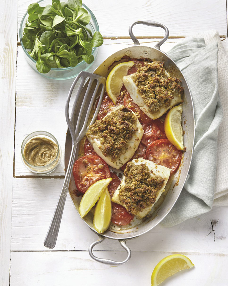 ④• Badigeonner les filets du mélange anchoïade chapelure afin de créer une croûte. Enfourner 20 minutes.