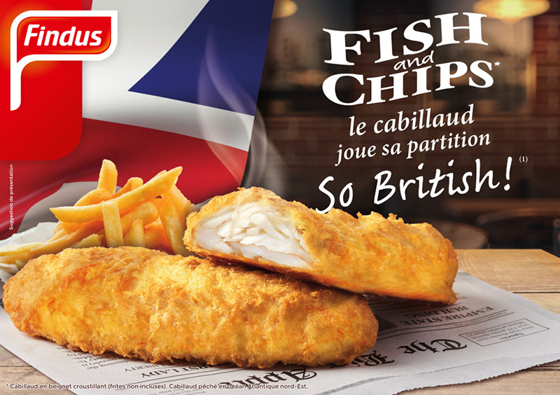Et sur la table, l’un des plats les plus typiques de la cuisine britannique : le Fish and Chips. Pour cette nouveauté, Findus a gardé l’esprit de la recette originale d’un poisson de qualité avec une pâte à beignet gourmande qui donne un bel enrobage doré à la texture croustillante. Pour varier les plaisirs, Findus a choisi une portion généreuse de Cabillaud, qualité 100% filet, issu d’une pêche durable en Atlantique Nord-Est et certifiée MSC ! Ce poisson au goût fin et subtil, riche en protéines, est celui que les Français préfèrent et consomment le plus*.