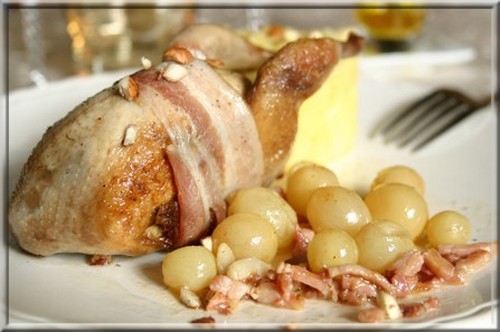 5-Servir les cailles sur assiettes chaudes entourées des lardons, des grains de raisin.