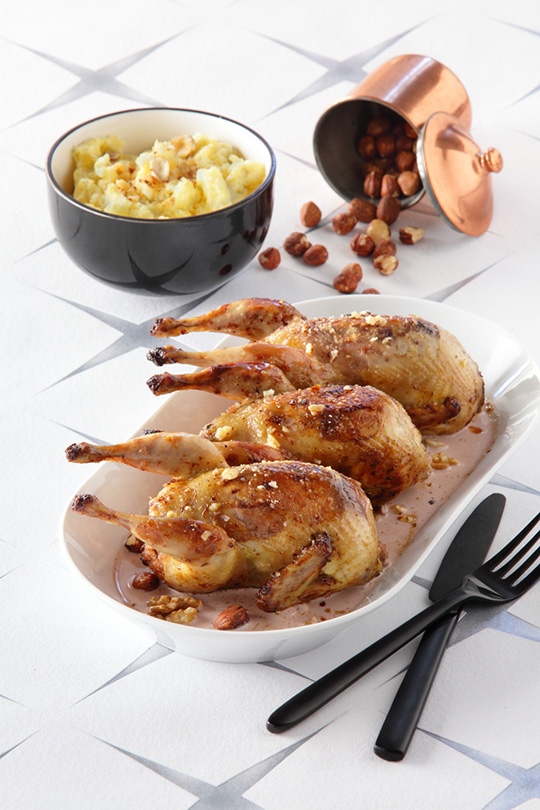 Cailles fermière Label Rouge farcies aux noix et aux noisettes, crème au Porto et aux échalotes