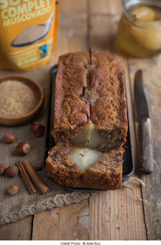 – Tamiser la farine et la levure. Ajouter à la préparation sans trop mélanger et ajouter le chocolat noir dessert haché en morceaux. Verser la préparation dans un moule à cake beurré et fariné puis déposer les 3 poires préalablement égouttées au centre du moule.