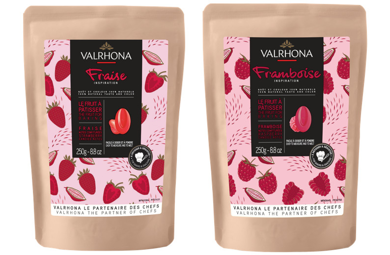 La couverture de fruits Inspiration Framboise de Valrhona exprime toute l’intensité de la saveur unique de la framboise, associée à sa couleur rose vif et naturelle. Une opportunité inédite pour le grand public de travailler en toute facilité ce fruit si fragile et si apprécié en toutes saisons.