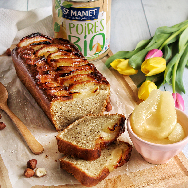 ④• Verser la pâte dans un moule à cake graissé. Couper les poires St Mamet en tranches épaisses et les disposer sur le dessus de la pâte à cake en les enfonçant légèrement.