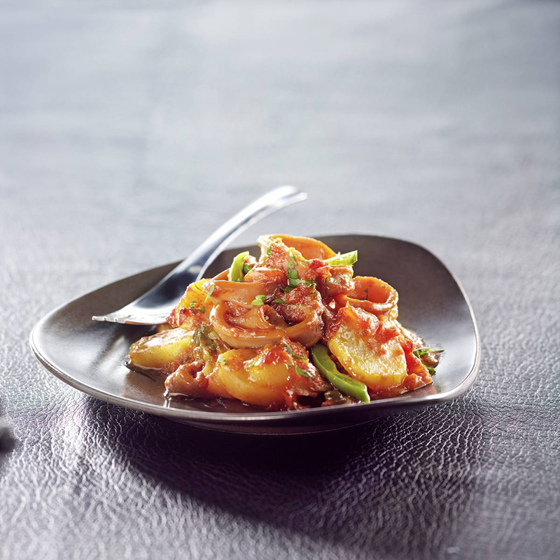 ⑥• Verser la moitié de cette sauce dans une cocotte allant au four, déposer les pommes de terre et les tomates pelées et tranchées, ainsi que les calamars, puis le restant de sauce.