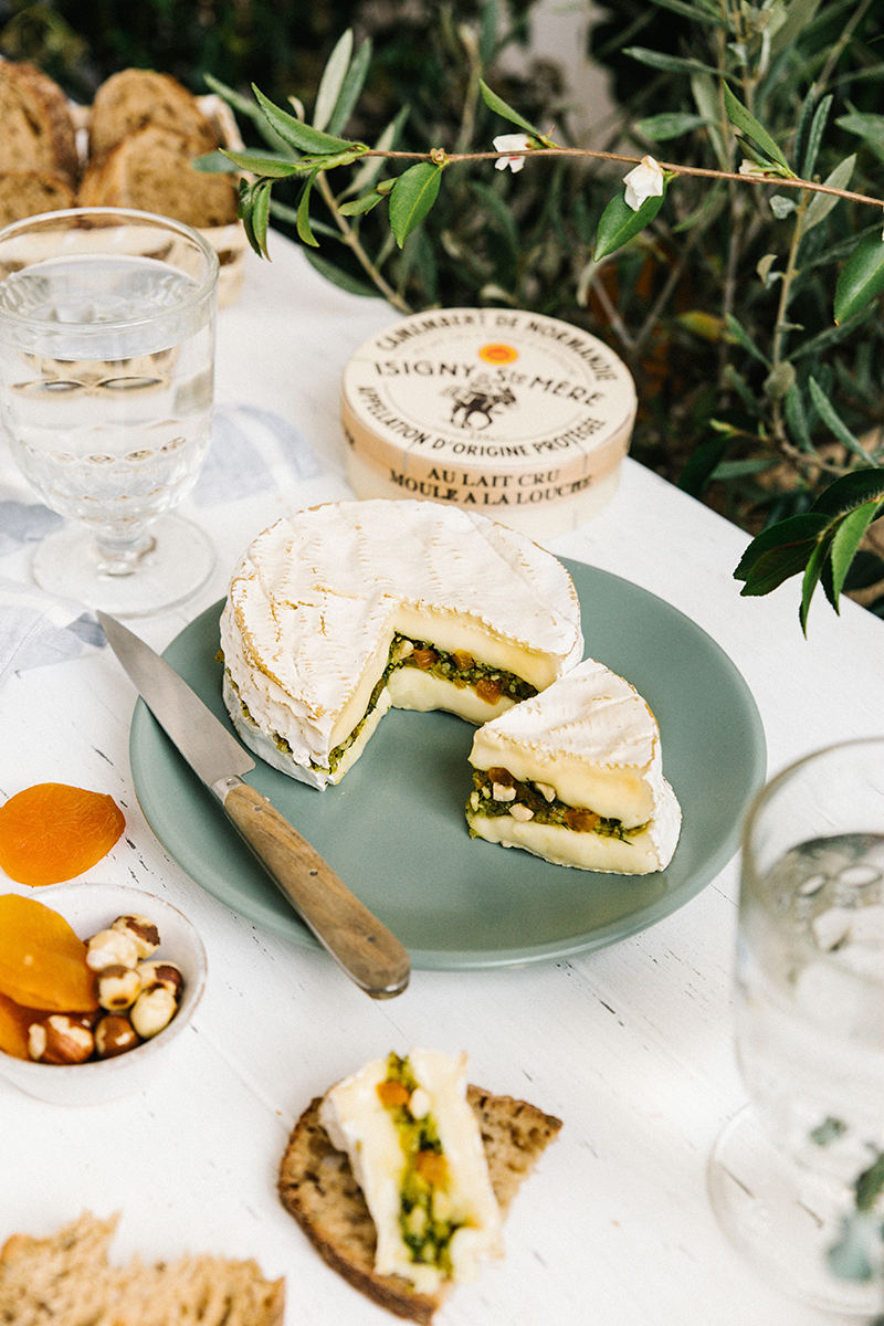 Camembert farci aux herbes aromatiques, noisettes torréfiées et abricots secs