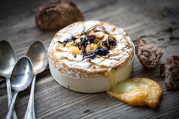 ②• Retirer le camembert de sa boîte, faire des incisions sur le dessus et le redéposer dans sa boîte. Le placer sur une plaque de cuisson.