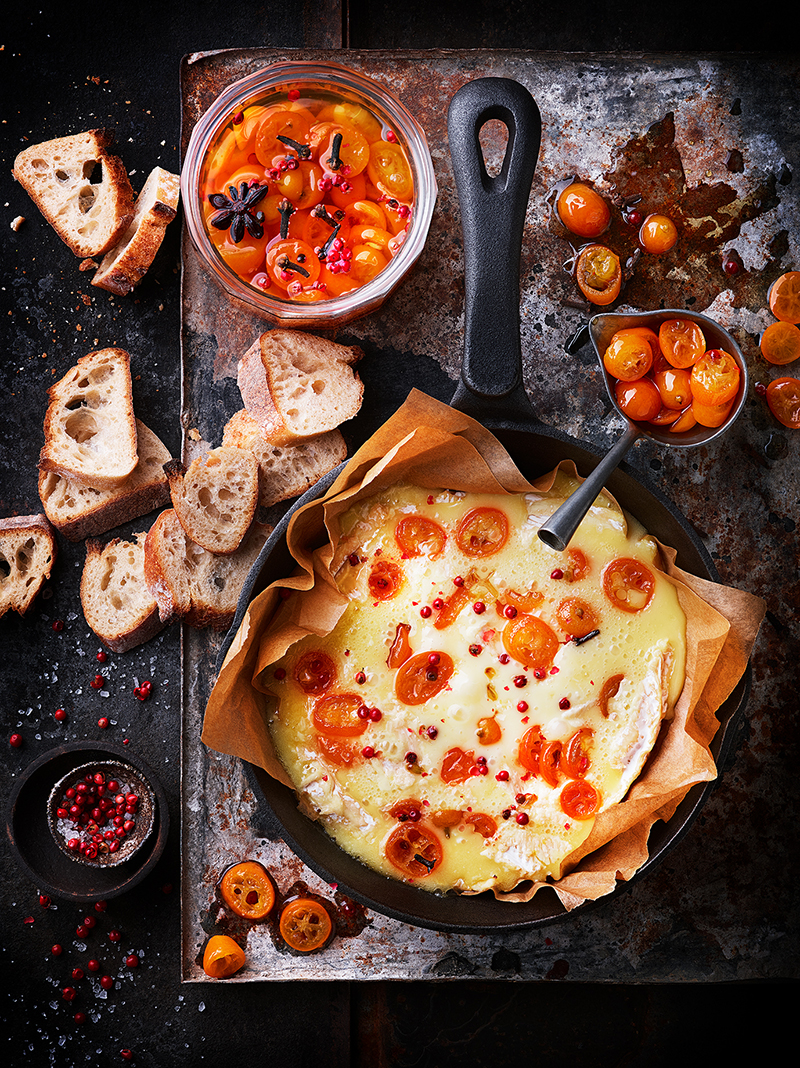 Servez le camembert avec le reste des kumquats et des tranches de baguette.