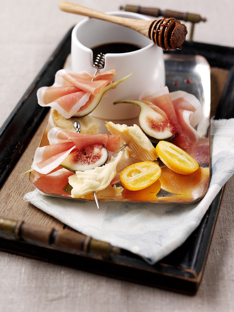 ②• Avec des bâtonnets à cocktail, former des apéritifs avec des figues et/ou des kumquats, des bouchées de mozzarella fumée et des tranches de jambon de Parme et les placer sur une planche à découper ou un plateau.