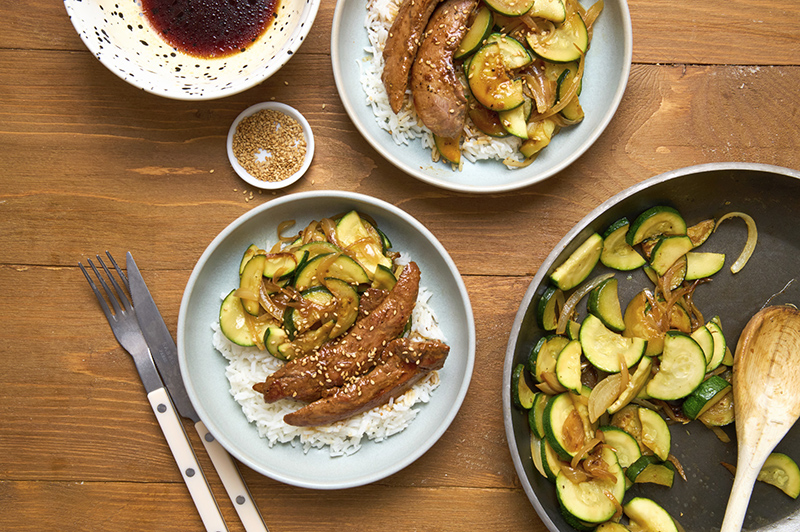 ⑧• Dans une assiette, servez le riz avec la poêlée de courgette et les aiguillettes de canard.