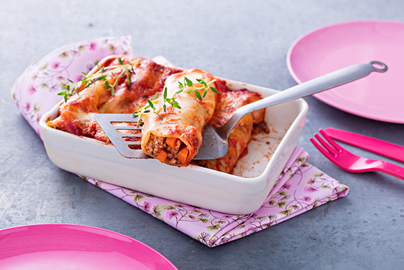 ⑤• Disposer les cannellonis dans un plat, les recouvrir du reste de coulis de tomates, de mozzarella et de parmesan et les cuire au four jusqu’à ce que les fromages soient fondus et dorés.