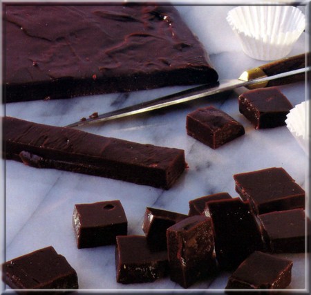 2-Disposer,sur un plan de travail beurré,4 règles de bois beurrées,pour former un grand carré.Y faire couler la pâte de chocolat,laisser refroidir.Découper au couteau en petits carrés.Laisser raffermir ces canougats avant de les retirer du plan de travail.