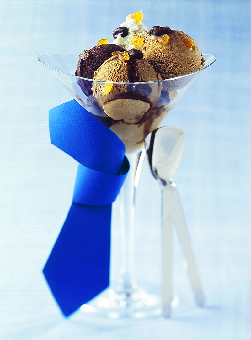 ①• Sortir la glace au café et le sorbet au cacao du congélateur un peu à l’avance, pour qu’ils ne soient pas trop durs lors de la préparation des coupes.