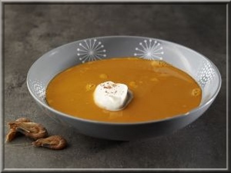 Garnir les assiettes creuses de bisque, placer un peu de crème fouettée à la surface.