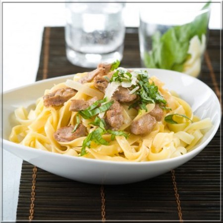 2.Pendant ce temps, cuire les tagliatelles, les égoutter et les verser dans la poêle, remuer. Cuire 1 minute à feu vif.